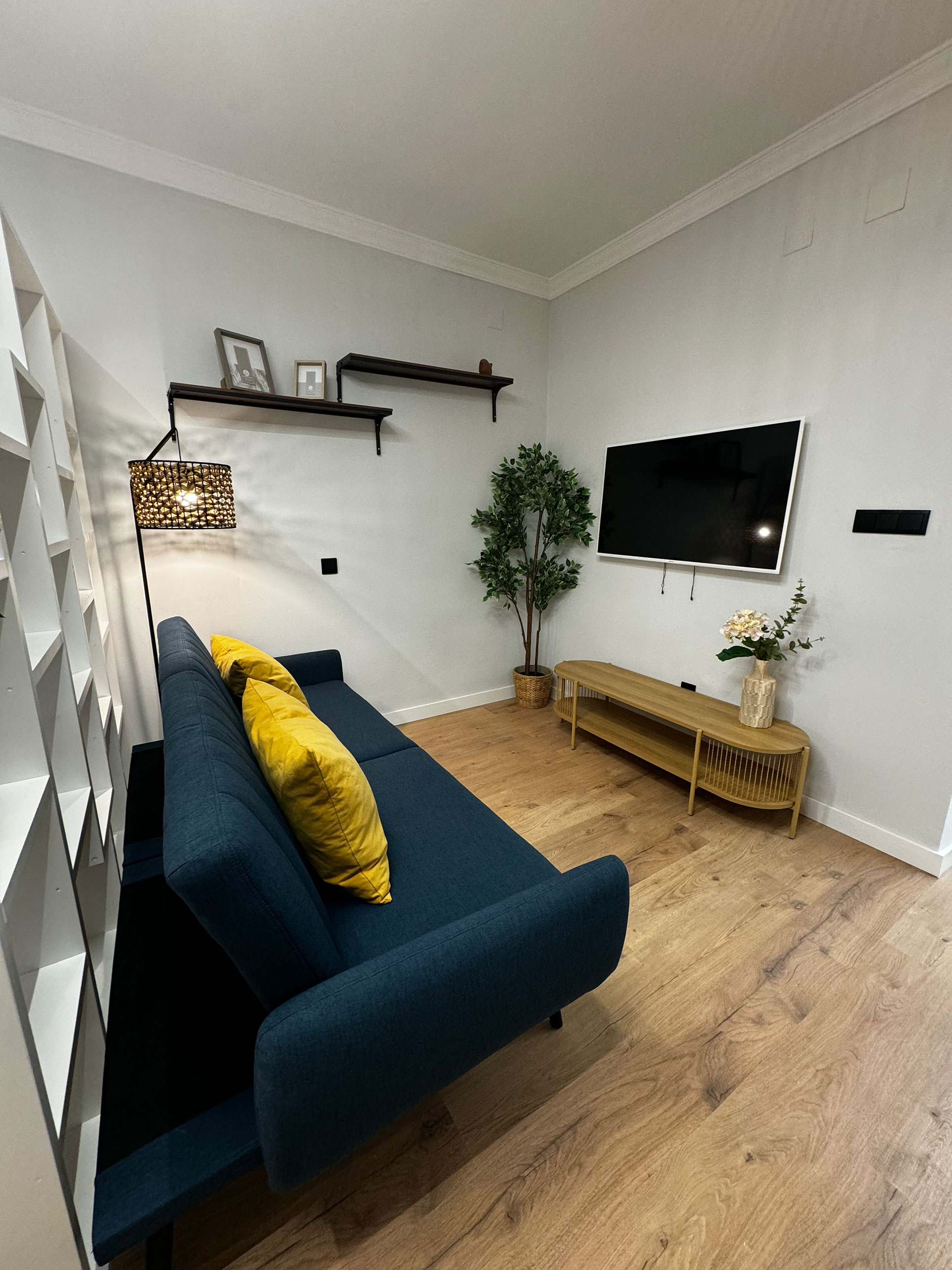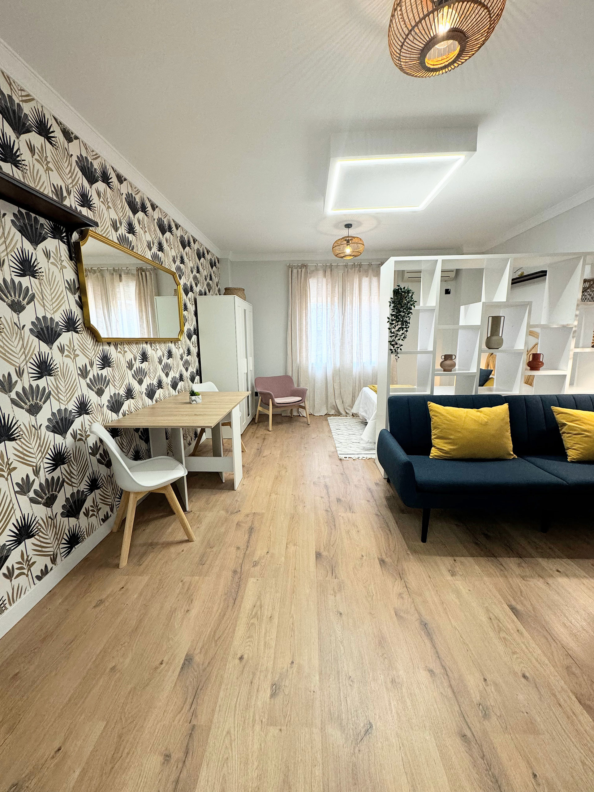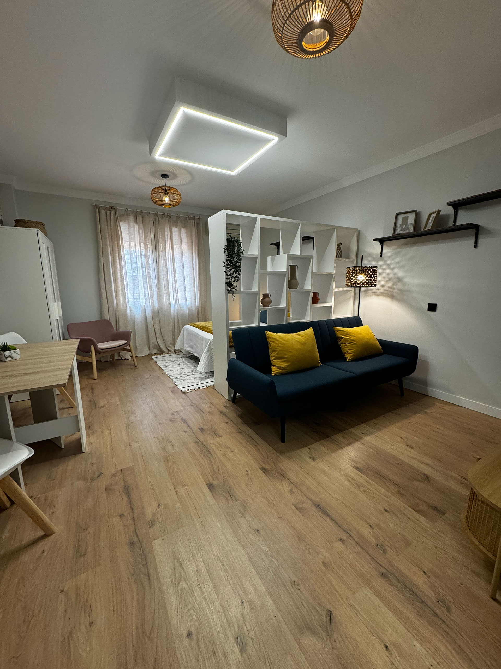 Un estudio de un dormitorio donde tenía que albergar comedor, salón y dormitorio en el mismo espacio, cocina abierta y baño.