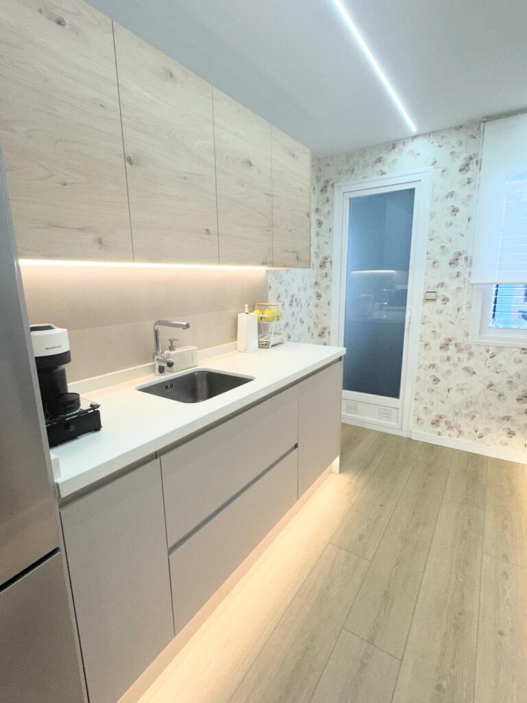 - dos tiras LED neutras a lo largo de la cocina