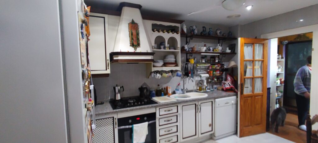 Mobiliario completamente nuevo en lavadero y cocina. Además añadimos electrodomésticos, y detalles como un cubo para las cáscaras de verduras cuando cocinan integrado en la encimera.
