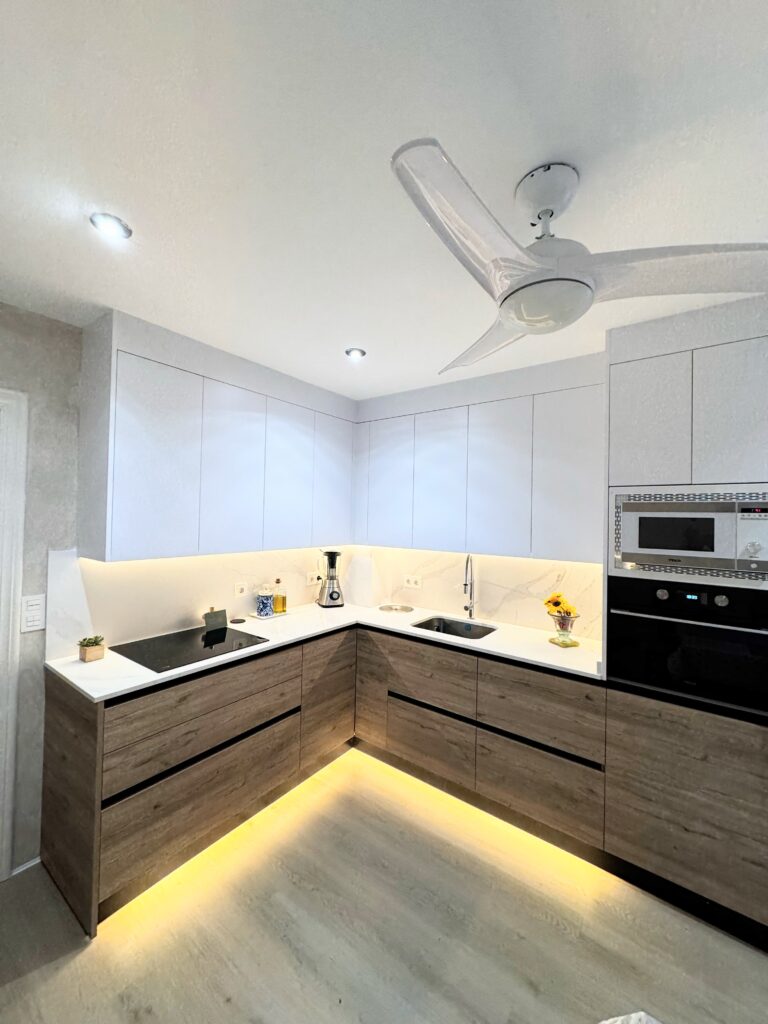 Además como maravilloso detalle, añadimos luz led cálida en los zócalos bajo muebles. Un detalle que, aunque parezca pequeño, suma mucho. Diría que ¡muchísimo!