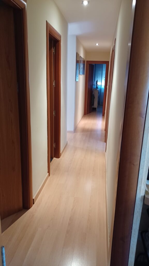El suelo anterior, de tono oscuro, fue reemplazado por suelo laminado de color madera clara. Este cambio no solo moderniza el espacio, sino que también contribuye a hacerlo más acogedor y amplio. El nuevo suelo se complementa perfectamente con el color de las paredes, haciendo que el pasillo se vea mucho más integrado y coherente.
